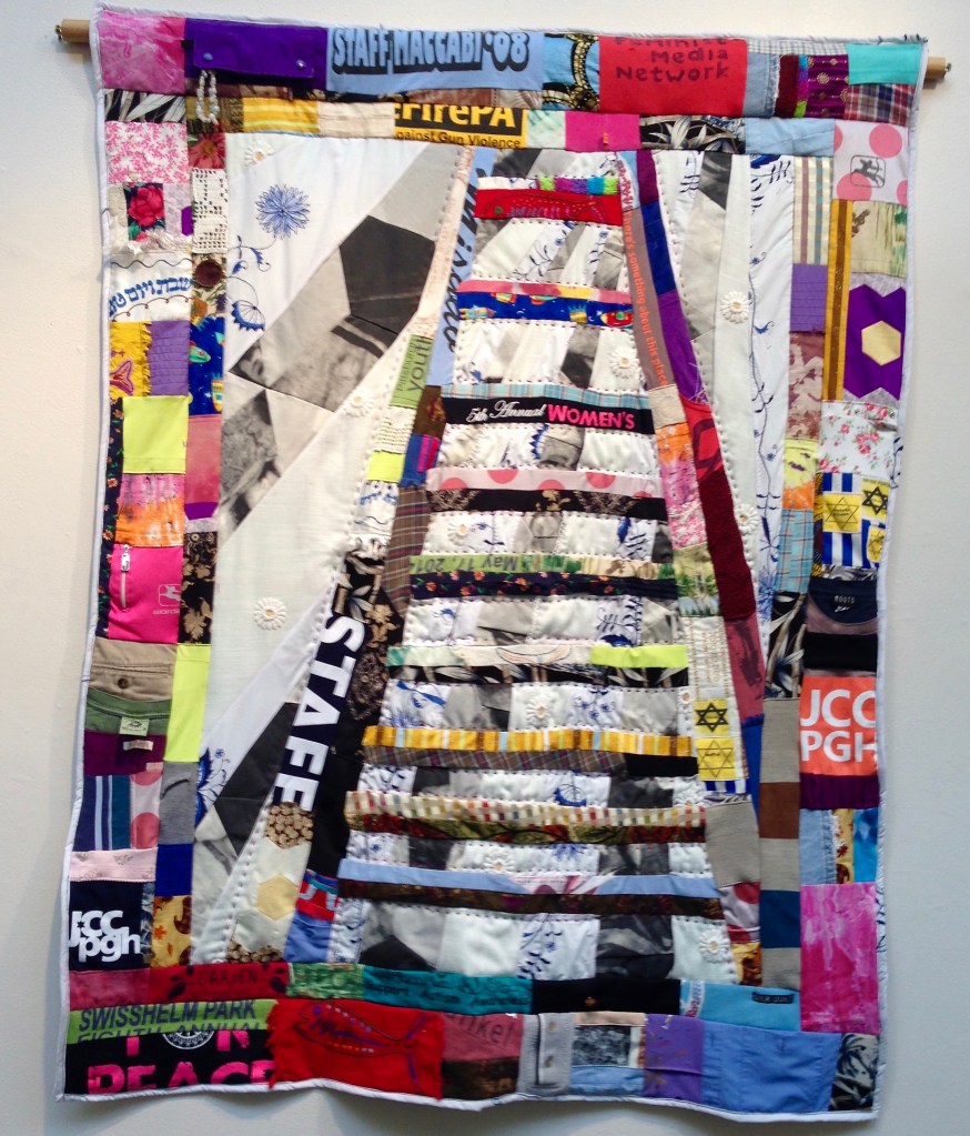 L. Jacob’s Ladder; 60”H X 56”W; Machine Pieced and Hand Quilted Materials of Memory from JCC Community including challah cover, logo tee-shirts, napkins, biker shirts, men’s sport shirts, baby onesie, tie-dye shirts, bedspread, table clothes, quilting fabric, chemo-cap, Mexican embroidery, African fabric, Holocaust Star and photo, rags, crocheted doily, beads, apron, painter’s pants, pajamas, upholstery materials, knitted shawl, hand-batik fabric, curtains, woman’s blouse, hexagon quilt pieces, denim jeans, men’s work shirts, men’s khaki shorts, woman’s skirt, carry bag, woman’s suit jacket. Collection of American Jewish Museum.