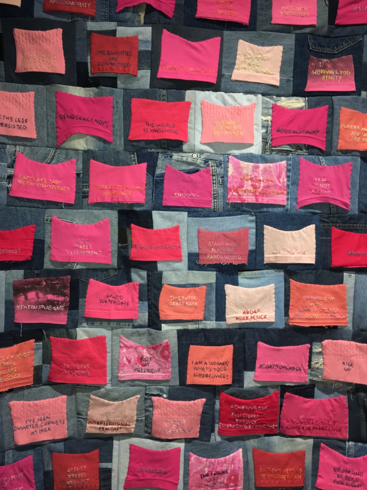 On each hat is a hand-embroidered protest statement taken from the signs held at the march including such statements as: NOT MY PRESIDENT, I AM A WOMAN. WHAT’S YOUR SUPERPOWER?, PUSSIES AND RIGHTS ARE NOT UP FOR GRABS, THIS IS WHAT DEMOCRACY LOOKS LIKE, I’VE SEEN SMARTER CABINETS AT IKEA, OUR BODY OUR MINDS OUR POWER, and THE WORLD IS WATCHING.