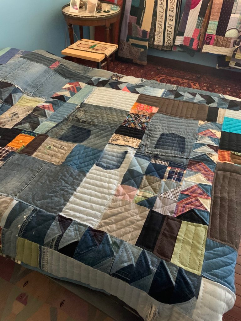 Pittsburgh-based fiber artist, Louise Silk, creates art that combines aesthetics and functionality with meaning and memories. From the influence of a 1972 MS Magazine article to the current SILKDENIM label, her quilt experiences culminate in a display of her particular capacity to use her patchwork skills to piece together just about anything into an aesthetic meaningful whole.