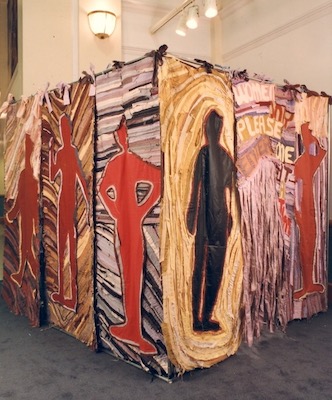 The first piece was a small applique diptych about the Russians. On the left, the Russians standing in a long line wearing drab browns. On the right, they danced the hora in bright pastel colors. The second was a curtain, representing the fall of the Berlin wall, with patchwork words like freedom and perestroika.