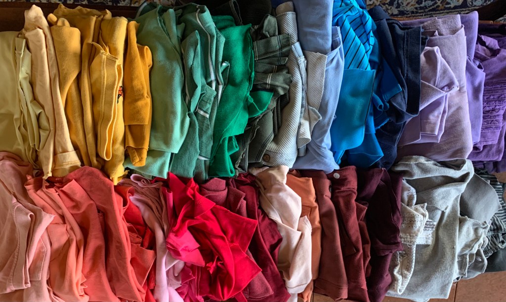 For example, I got together this very sophisticated palette of 5 shades each of 8 hues of tee-shirt materials to make an updated Tree of Life Quilt.