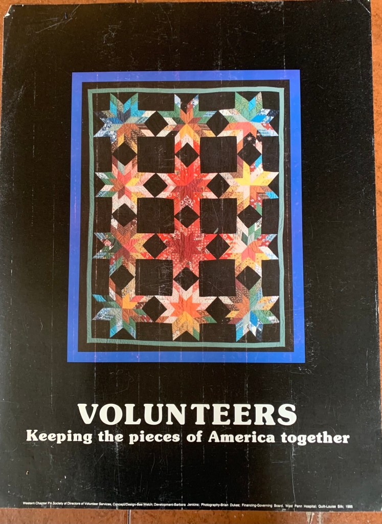 I accomplished my goal but now was left with lots of leftovers. What should I do with them? The range of colors reminded me of this quilt that was featured in this poster, made over 30 years ago: