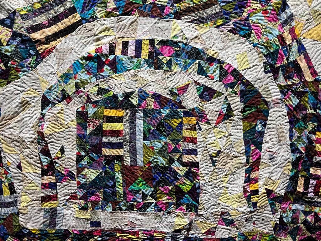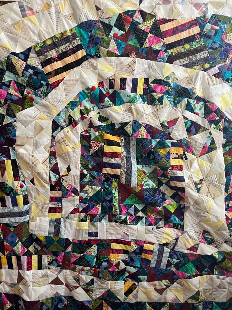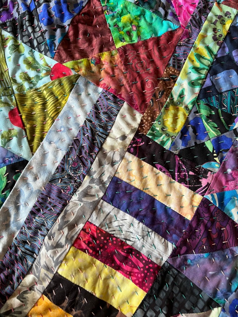 I decided to take a break from working on my next one-person exhibition and make a random art quilt. I pieced some of my old quilting fabric favorites into multiple triangle- pieced sections. For contrast, I added triangle sections from light colored men’s shirts. To stitch in the spirit of Indian technique of Kantha and/or the Japanese technique of Sashiko, both of which I admire, I quilted more than 400 meters of dmc pearl cotton onto a backing of leftover pieces of kantha quilts purchased from ETSY.