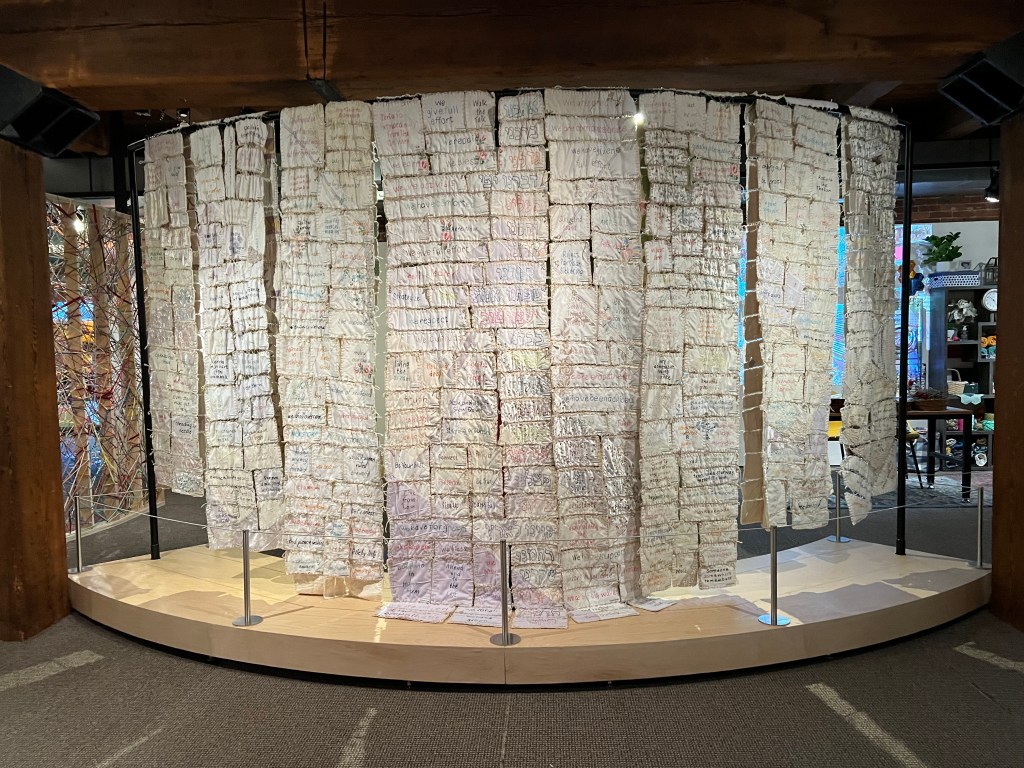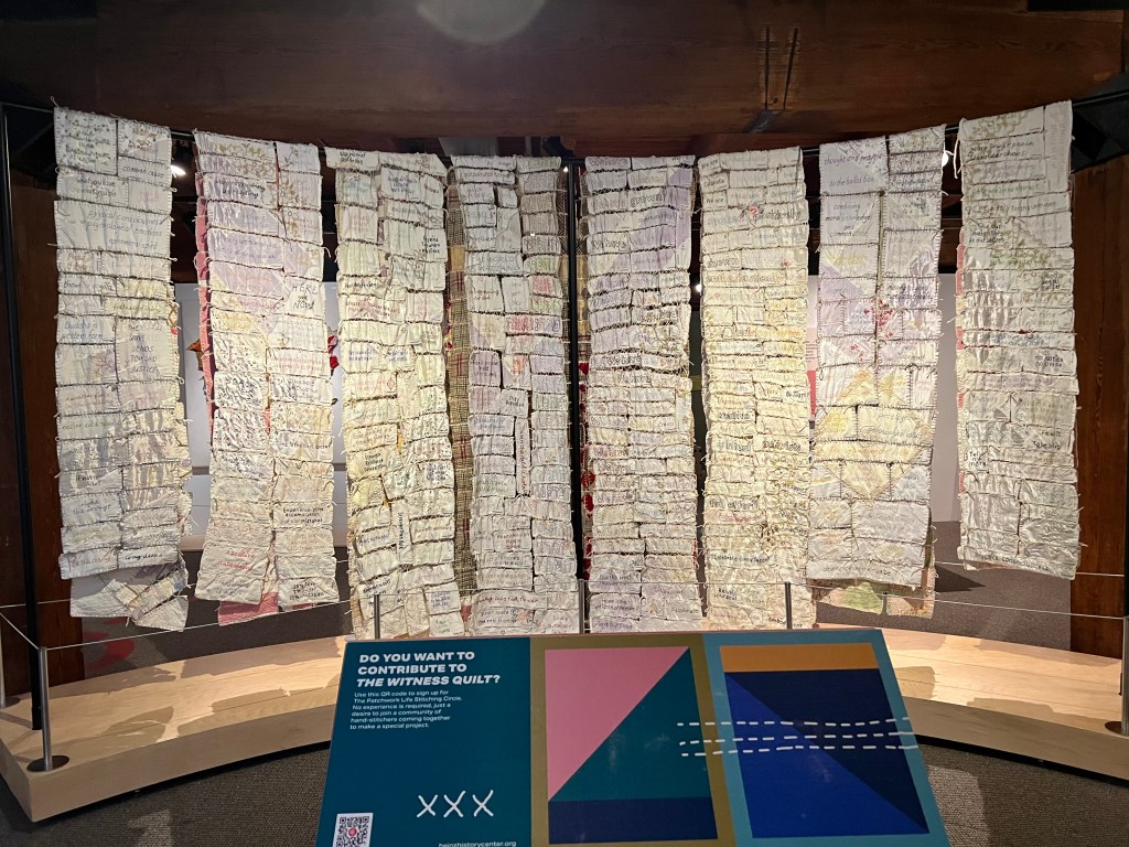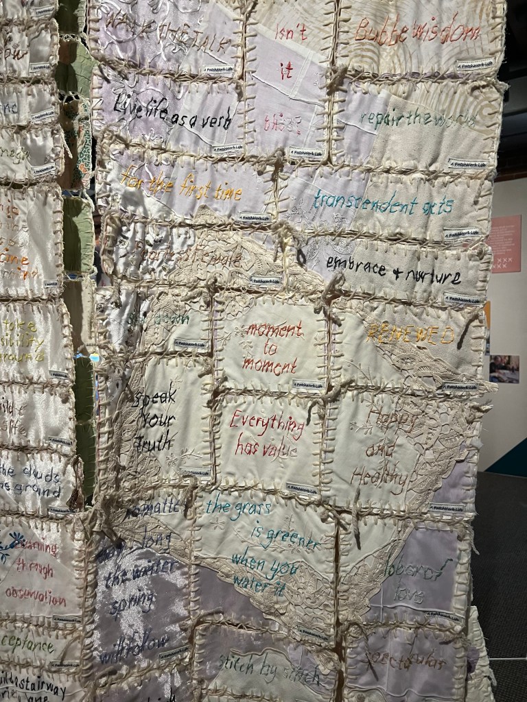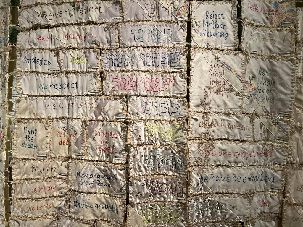 I created “The Witness Quilt” to transform the experience. The all-white under layer, traditionally worn during Yom Kippur as a kittel, is embroidered with a “positive vidui” created by Rabbi Avi Weiss: We have love. We have blessed. We have grown. If confessing misdeeds is a way to acknowledge failings, confessing good deeds may be a way of setting a path forward. La Shana Tova!