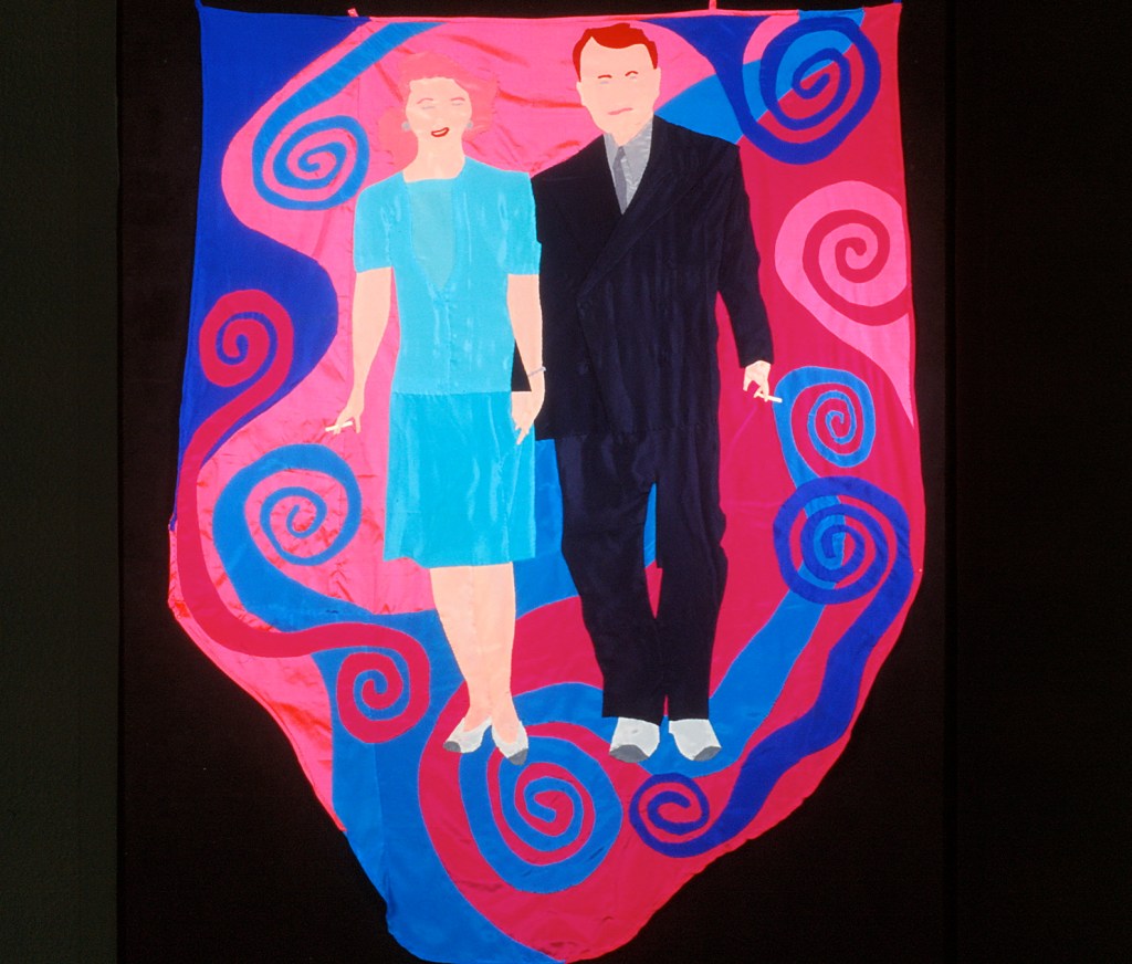 The signature quilt for the Pieces of Memory exhibition was a life size portrait of my parents in their youth, Sadye and Howie. It was made from a collection of silk yardage they had purchased as gifts for me from their travels. Using them accessed significant memories of my parents’ love and support. Silk is very slippery, making it difficult to use in quilting and so the remainder of these silks sat dormant in my studio until I was unable to celebrate my 70th birthday because of the Covid-19 Pandemic. Experiencing the effects of Covid motivated my development of a ten-year-plan to produce the needlework that could bring my career to a coherent purposeful conclusion. I began by reclaiming the leftover silks and using them to produce fourteen flags, a kimono, and a quilt.