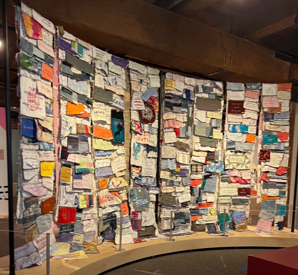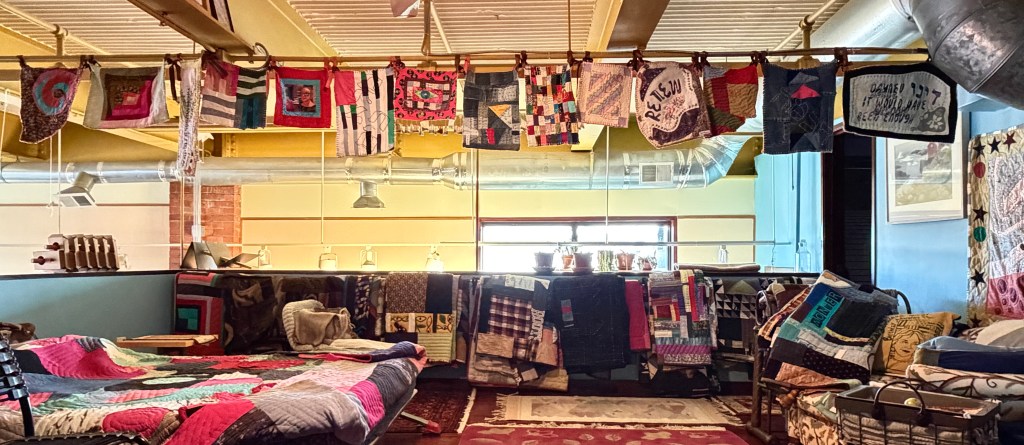 Throughout the run of the exhibit, volunteer stitchers worked with me adding patches to the quilt. During the last 3 months of the exhibit, we unmade the quilt, piece by piece, giving away the patchworks to museum visitors. This dynamic collaboration became the narrative arc of the exhibition. The installation highlighted quilting’s interactive and communal aspects, integrating elements of my Jewish cultural expression and aspects of a Zen practice into the broader fabric of American life.