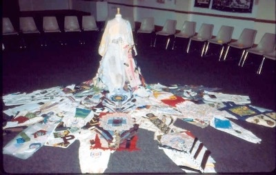The centerpiece of the exhibit was The Witness Quilt; a larger-than-life kimono composed of 1525 individual detachable patchworks. The outer layer of patches was a collection of affirmative maxims called BubbeWisdoms, hand-stitched onto personally significant scraps of fabric collected from visitors. The under layer was a positive contemporary version of the Vidui Yom Kippur Prayer. The Vidui traditionally confessing all our negative actions. The installation engaged viewers in another innovative sacred ritual.
