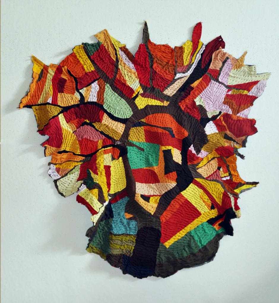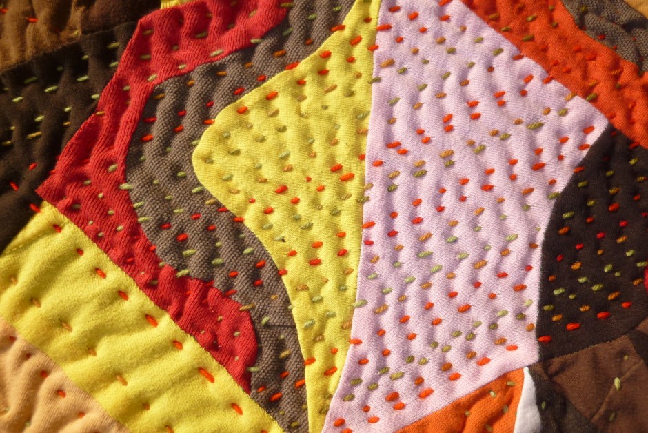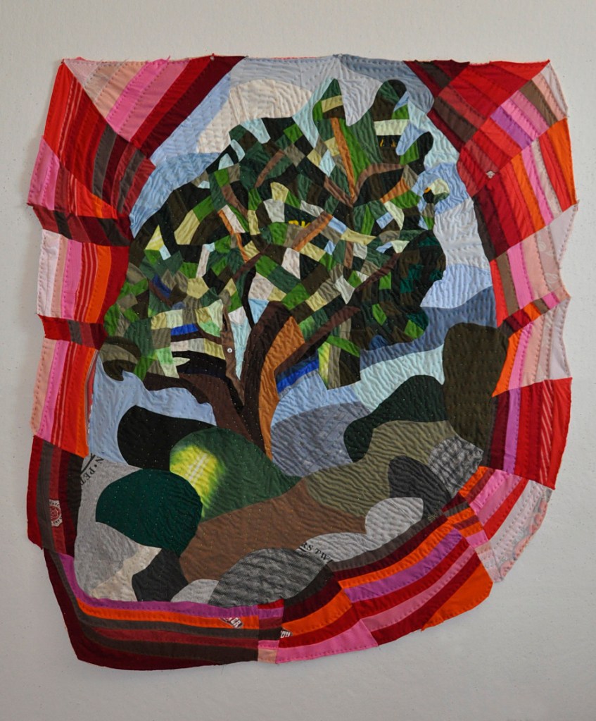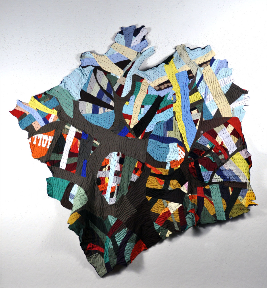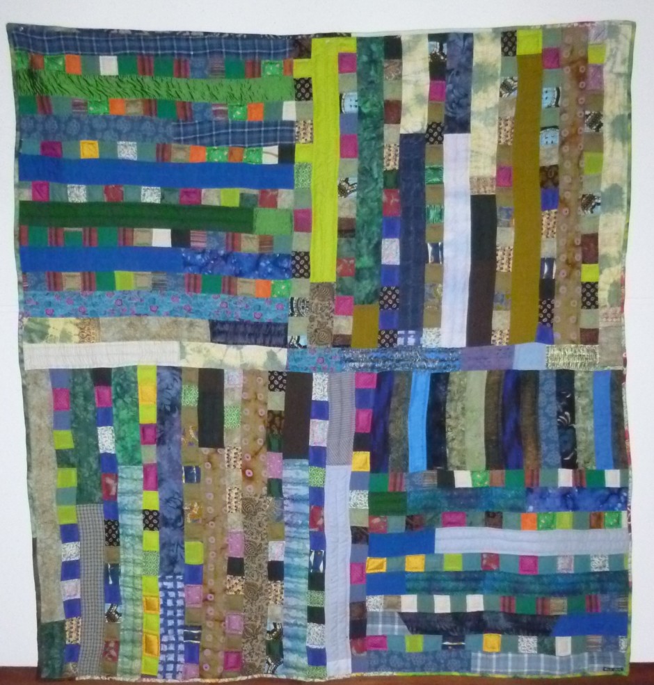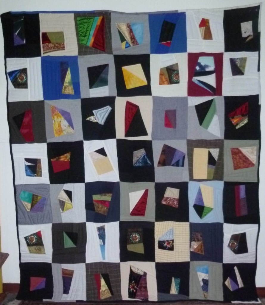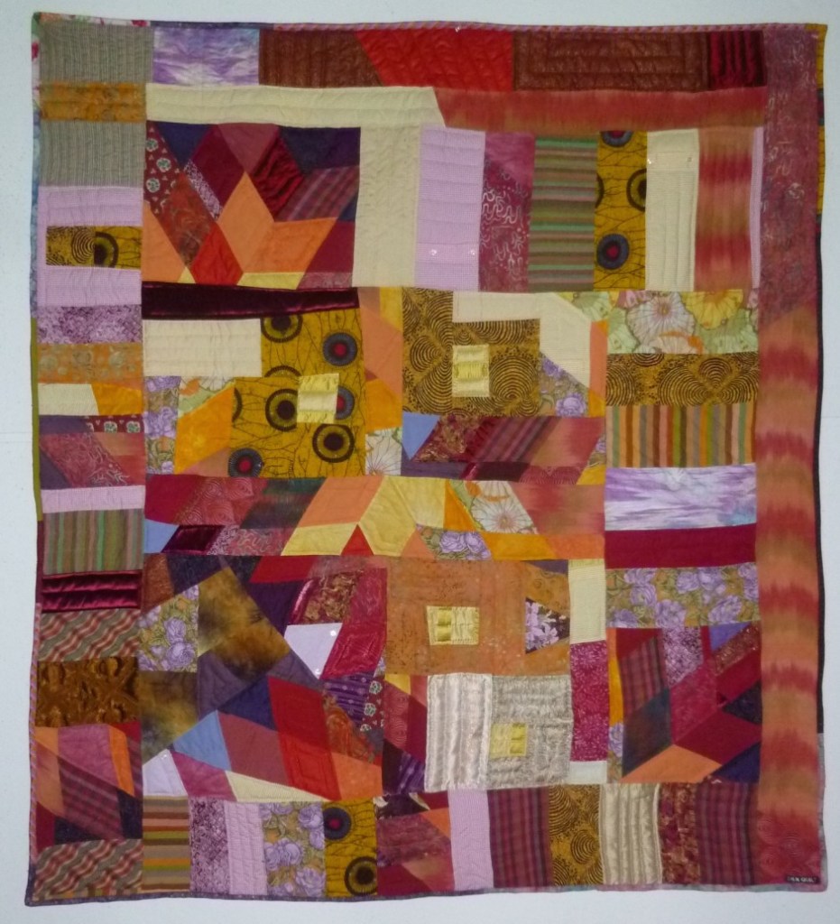 Jacob’s Ladder; 60”H X 56”W; Machine Pieced and Hand Quilted Materials of Memory from JCC Community including challah cover, logo tee-shirts, napkins, biker shirts, men’s sport shirts, baby onesie, tie-dye shirts, bedspread, table clothes, quilting fabric, chemo-cap, Mexican embroidery, African fabric, Holocaust Star and photo, rags, crocheted doily, beads, apron, painter’s pants, pajamas, upholstery materials, knitted shawl, hand-batik fabric, curtains, woman’s blouse, hexagon quilt pieces, denim jeans, men’s work shirts, men’s khaki shorts, woman’s skirt, carry bag, woman’s suit jacket.