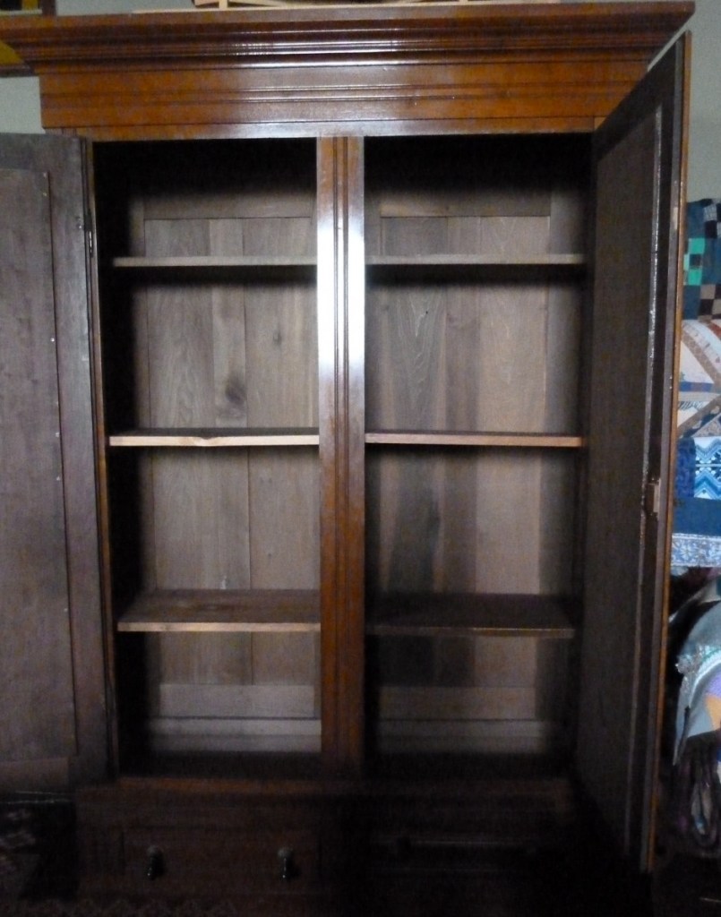 My container is a large Walnut Armoire. I bought it at an antique store on Perry Highway for $350.00 in 1978. It is held together with 6 screws. For its life with me it first housed records, tapes and listening devices and then was transformed to host an ever-changing parade of quilts.